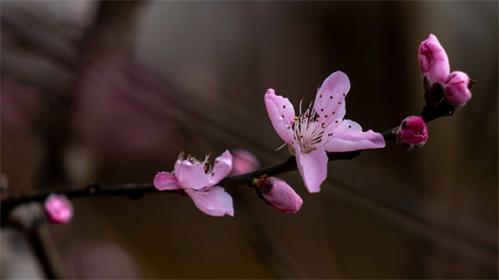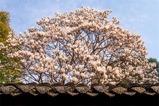 祠内的花儿似乎格外喜水,身子总是朝水面倾倒。瞧那粉白海棠几乎要贴近了水面,一朵朵花朵也朝着水面绽放,不知是在照镜子爱美呢,还是想与池水来个亲密接触。还有那消寒馆里的桃花,同样倾倒,不论远看还是近瞅,总似假花,她绽放得实在是太完美,那一抹桃红,不深不浅,恰到好处,每一枚花朵均匀等大,优雅地缀在枝头。微风轻拂,三两花瓣悠然落下,悄然击碎了真假的臆想。