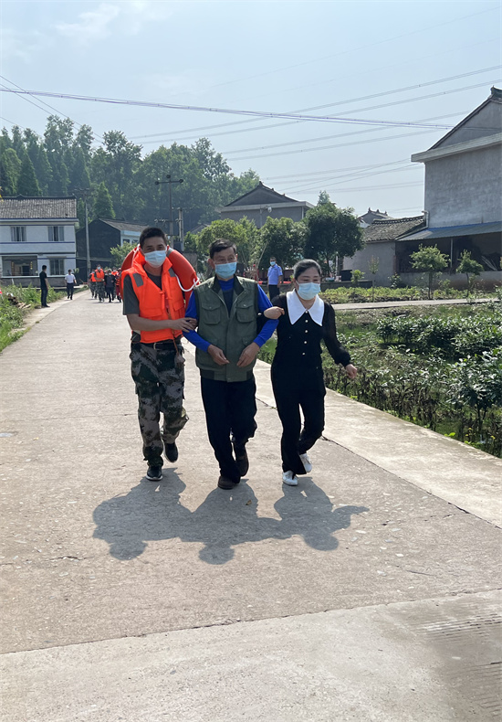 演练复盘再现2021年8月19日,余坪镇局部出现短时强降雨,导致水位激增、房屋进水,严重威胁群众生命财产安全,紧急撤离群众的过程。