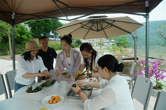 四川新闻网消息 6月3日,在四川省洪雅县槽渔滩景区的“云水涧”民宿院落里,在这里度假的游客与当地的原住民一起过一个既有传统习俗又有现代元素的端午佳节。