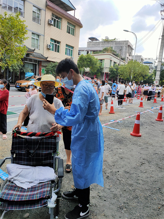 下午2点,20余名橄榄绿志愿者顶着烈日奔赴疫情防控志愿服务一线,静待前来检测的市民,他们穿上密闭的防护服,戴上口罩,志愿者们仅仅10分钟已是汗流浃背,但这丝毫没有减退他们服务的热情,积极协助医务人员、观音街道办事处工作人员开展现场引导、体温监测、秩序维护、健康码扫描、帮助老年人申请健康码、搀扶行动不便的老人,为群众答疑解惑、提示群众戴好口罩等工作,通过有序组织和引导,参与检测的居民严格按照规定流程进行扫码、采样,整个核酸检测工作有条不紊进行,全面筑牢了防疫“安全墙”!