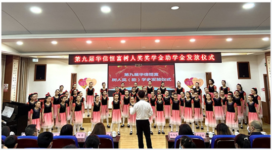 上午10点30分,仪式在三苏路小学三苏少年合唱团《你来了》的优美歌声中拉开了帷幕。华信恒富集团向全区10名优秀教师和10名学生各发放奖(助)学金5000元,共计10万元。