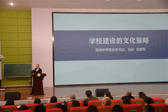 苏祠中学校长岳家军作《学校建设的文化策略》专题讲座。他以苏祠中学校园文化建设为例,从文化取向,文化建构,文化呈现,文化生长,文化表达五个方面阐释了校园文化的建设内涵和策略。
