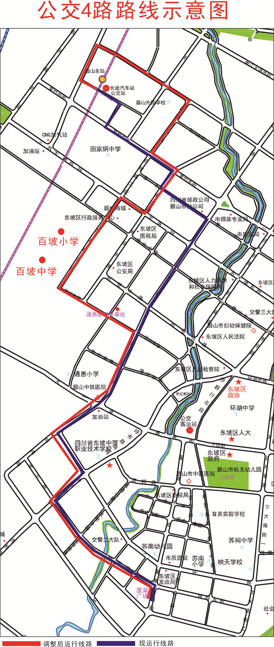 调整后运行线路及站点:眉山东站(公交站)—铁环东路(同升二期)—眉山东站—百坡路口—田家炳中学—电信家属区—百坡小学(消防大队)—通惠社区医院(百坡中学)—老年大学—赤壁路口(单)—徐州中路路口(单)—子瞻医院—一环西路—诗书路口—诗书路南段—凤翔路口—区交通局—蓬莱广场。