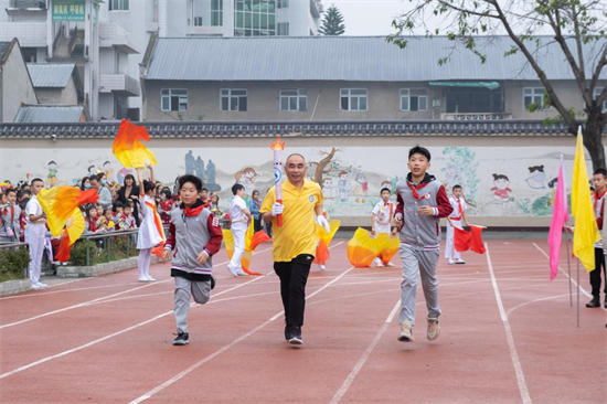 学校各年级师生代表手持火炬依次接力绕场一圈,将更高、更快、更强的奥林匹克精神和团结、阳光、进取的运动宣言传遍校园,校长陈曦在全校师生的见证下把火炬庄严地插进火炬台。