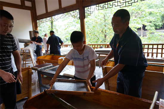 在柳江古镇,还可以沉浸式地体验动手的乐趣,那就是雅纸制作。柳江心洲岛“雅纸体验馆”是省级非遗――洪雅雅纸制作技艺在柳江古镇景区宣传展示的一个场所。该体验馆里收集展示着洪雅雅纸制作技艺的工具,相邻的柳江书画院也以图片形式面向公众详细介绍雅纸古法制作技艺的主要流程。体验馆不时举办活动,免费提供材料,由专业的雅纸制作师傅带着游客体验雅纸制作。