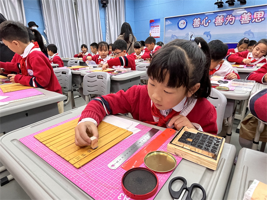 了解了活字印刷术的历史之后,现场参与师生一同踏上了“中国古代四大发明之活字印刷”的体验之旅。在志愿者的指导下,孩子们运用手中的工具,通过选字、排版、刷墨、覆纸、拓印等工序,一步一步地完成活字印刷的操作实践,制作出一幅幅各具特色的诗词活字印刷作品。“我用活字印刷术印刷了最喜欢的古诗<静夜思>,我一定要好好保存它。”学生付淳羲高兴地说,今天的课程非常有意义,在愉快的气氛中不仅学到了很多有趣的知识,更了解了中国传统文化是如此博大精深。