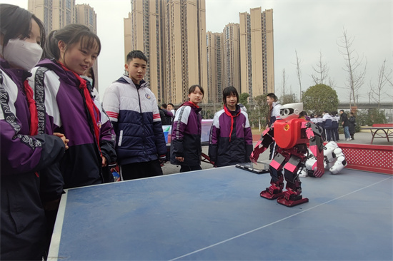 活动现场,主办方分别设置了科普仪器互动、无人机表演、机器人展示、航模表演、科学实验台等板块。“哇,还会变化队形!”“它从波浪线变成了五角星!”无人机编队表演花样百出,引人注目,同学们不禁感叹连连。“这个机器人好酷啊,它跳舞的样子真可爱!”伴随着激扬的音乐,高科技人形机器人在校园翩翩起舞,滑稽又不失专业的舞步引来师生们阵阵喝彩。
