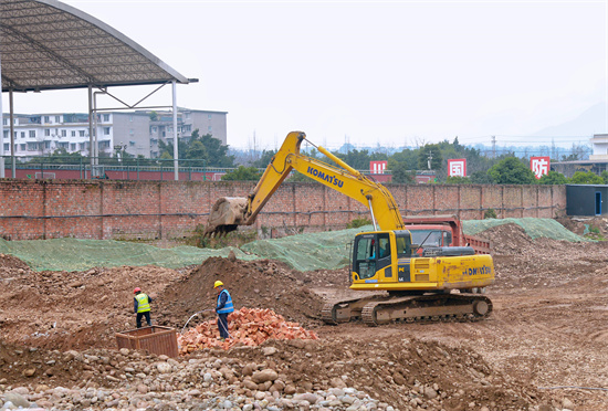 2月12日,项目施工现场,机械轰鸣声不断,呈现一派热火朝天的施工景象:挖掘机正挥舞铁臂开挖建设基础、整理地平,工人们忙着砌砖墙、浇注地基等。
