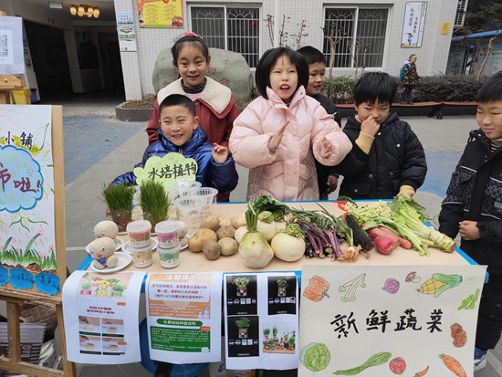 接着,各个摊位准备就绪,农贸市场活动正式开始。“爱心联盟”“鲜到先得”…每个摊位前架起了各具特色的广告牌。同学们将劳动成果分门别类摆放好,白菜、花菜、莴笋等,应有尽有。