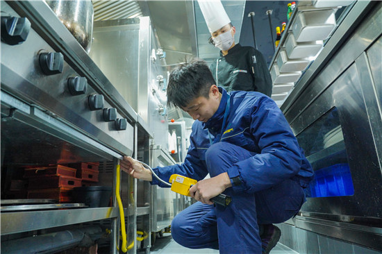 2月16日,在彭山区一家刚安装开通天然气设备的中餐厅,一名燃气安检员认真检查管线,不落下一处死角,此次重点检查这里的燃气设施是否正常、报警器是否安装到位、燃气安全警示标志是否张贴明显等,全面做好排查工作。