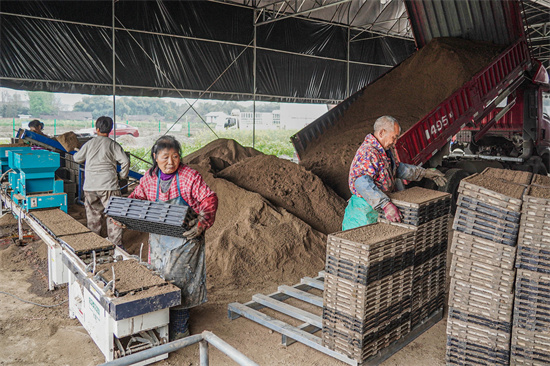 近日,走进位于彭山区金烛村的成林农业综合育秧基地育秧大棚内,工人们正在育秧流水线上娴熟操作,经过装底土、压实浇水、播种、覆土4个步骤后,一块块长方形的育秧盘成品源源不断从生产线上“诞生”,随后这些成品秧盘被送往一旁的大棚内进行催芽。