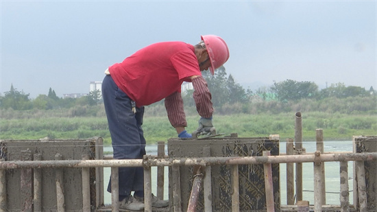 在岷江青龙大堤看到,目前左右两岸的混凝土堤坝大部分已经浇筑完成。由于江水经年累月的冲刷,原先的江堤已经出现了堤面松动,堤底悬空等隐患,自去年12月起,该区开始对旧有堤坝进行新建改造。此次翻新改造,重新填充了堤坝的水下基地,并新增了一道向水面延伸的马道,以此增强整座大堤的稳定性。