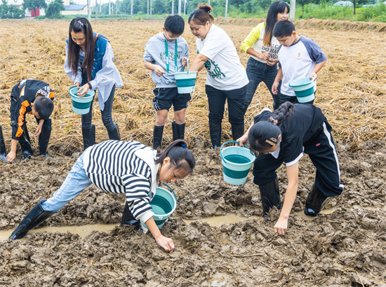 此次丰收节活动还加入了以“大手拉小手 泽泻种起走”为主题的亲子耕种活动,来自该区的20余名小学生在家长的陪同下,提着塑料桶,穿着筒靴走进田间种起了泽泻。志愿者详细地向亲子家庭成员们讲解泽泻的栽种技巧和注意事项,讲述了不同农作物的播种时间和收获时间,让在场的小朋友们感受到了大自然的神奇以及农耕的辛苦。