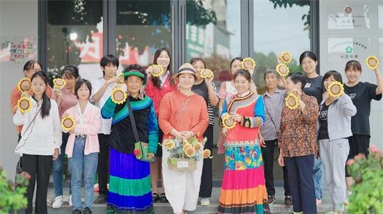 学员们开心地展示着编织好的向日葵零钱包。何亚卓摄