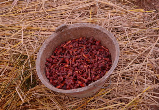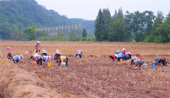 近日,在洪雅县柳江镇兴胜村高标准农田里,随着稻谷收获归仓,中药材川芎的种植也拉开帷幕:在田野里,棕红色的川芎种子挨挨挤挤铺满了桶,数百名农民工分工合作,平整田地、喷洒生物农药、栽种、铺草,一派繁忙景象。