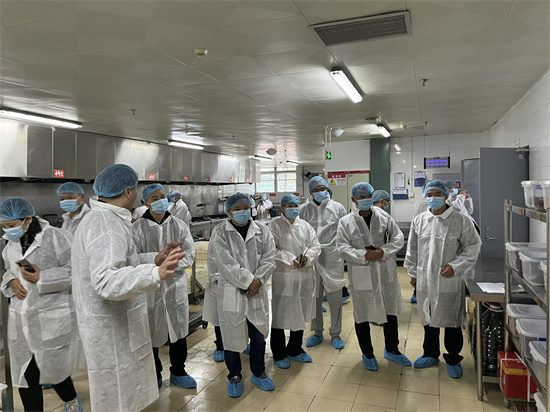 观摩人员在彭山一中现场观摩学校食堂食品安全责任落实情况,实地观摩学校食堂食品安全制度落实情况,食品采购验收、食品贮存管理、食品添加剂管理和使用、餐饮具清洗消毒、设施设备的配备、食品安全自查、各类记录的书写等情况,“日管控、周排查、月调度”落实情况,听取现场点工作人员和负责人相关讲解。