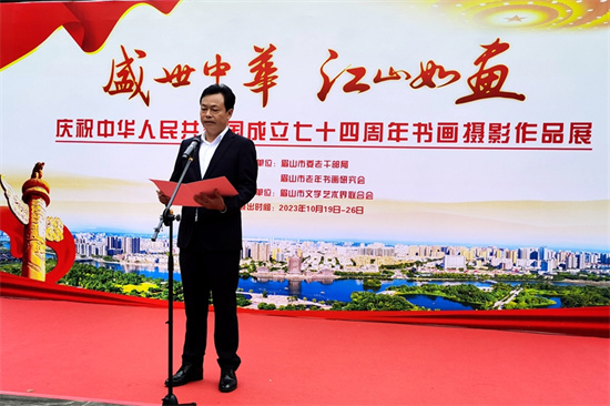 原眉山市人大常委会主任李忠国与多位市老领导同志出席,市老年书画研究会会长宋明刚致辞, 市委老干部局局长胡勇讲话,市老领导王宗惠宣布书画摄影展开幕。