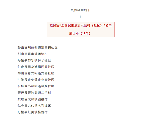 四川新闻网消息(帅玉洁 郑佳洁)日前,四川省司法厅、四川省民政厅公示了“全国民主法治示范村(社区)”复核结果,洪雅县止戈镇止火街社区保留“全国民主法治示范村(社区)”称号。