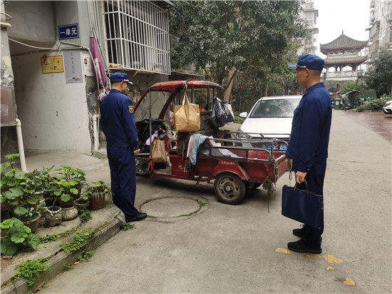 监督检查除隐患。彭山区消防救援大队消防监督员深入辖区居民小区开展电动车消防安全检查工作。重点检查了楼道口、疏散通道内有无电动车乱停乱放和违规充电;小区内是否配备电动车充电桩、设置电动车停放点;对小区内灭火器、消火栓等消防器材是否配齐并完好有效等安全隐患问题进行了详细检查。检查中发现仍有部分楼道内存在电动车随意停放、堵塞消防车通道、乱拉接电线给其充电等问题,大队检查人员立即对正在充电的电动车进行了断电处理,并责令物业管理公司立即整改其楼道停放电动车的问题,提出了相关整改建议。