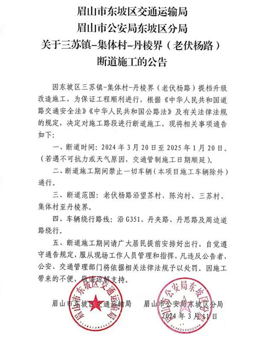 四川新闻网消息(郑佳洁)近日,本网从眉山市东坡区交通运输局获悉,因东坡区三苏镇-集体村-丹棱界(老伏杨路)提档升级改造施工,为保证工程顺利进行,根据《中华人民共和国道路交通安全法》《中华人民共和国公路法》及有关法律法规的规定,决定对施工路段进行断道施工,现将相关事项通告如下: