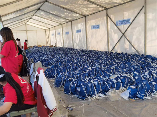 在领取现场,组委会工作人员和80余名学生志愿者顶着烈日,面带笑容的发放参赛包。今年的赛事装备里除了常规的大小号码布、别针、参赛服、参赛须知、号码簿、雨衣,还有组委会精心准备的“眉山特色”。