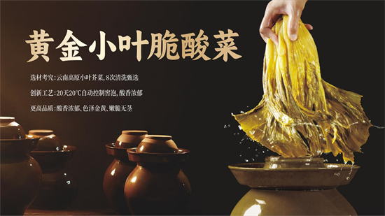 另外,吉香居依托对传统发酵工艺的深度研发,以及对消费者需求的洞察,创新推出了—“黄金小叶脆酸菜”产品。小叶脆酸菜选用云贵高原、质地脆嫩小叶芥菜。采用吉香居独家直投式乳酸菌发酵技术,薄盐乳酸恒温发酵,酸香浓郁、色泽金黄,是吉香居高品质酸菜产品代表。吉香居小叶脆酸菜,现已成为国内高端酸菜鱼品牌战略首选。用小叶脆酸菜制作的酸菜鱼菜品,酸菜比鱼更好吃!