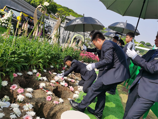 62名逝者的骨灰放置在可降解容器中深埋,不设墓碑、以花代墓,与鲜花土壤融为一体,让生命在繁花中绽放。