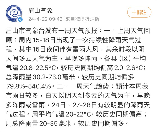 四川新闻网消息(彭静雅 郑佳洁)4月22日,本网从眉山气象局获悉,本周眉山各区县雨日较多,白天以阴天到多云的天气为主,早晚多阵雨或雷雨,24日、27—28日有较明显的降雨天气过程。周平均气温20-22℃,较历史同期偏高;周总降雨量20—35毫米,较历史同期偏多。