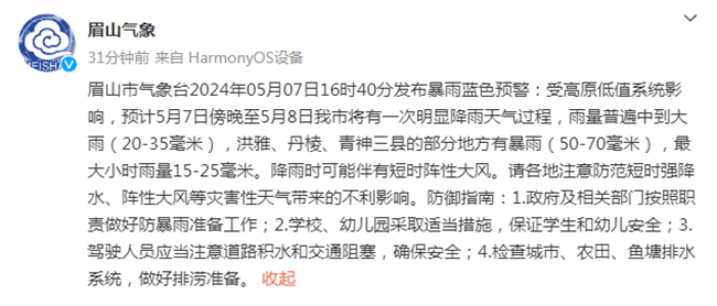 四川新闻网消息(彭静雅 郑佳洁)5月7日,本网从眉山气象台获悉,受高原低值系统影响,预计5月7日傍晚至5月8日眉山将有一次明显降雨天气过程,雨量普遍中到大雨(20-35毫米),洪雅、丹棱、青神三县的部分地方有暴雨(50-70毫米),最大小时雨量15-25毫米。降雨时可能伴有短时阵性大风。请各地注意防范短时强降水、阵性大风等灾害性天气带来的不利影响。