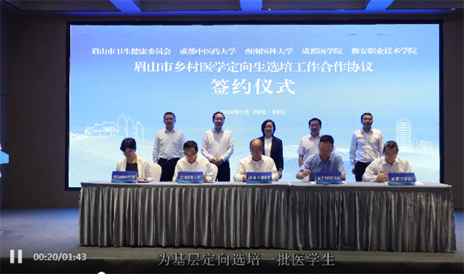活动中,眉山市卫生健康委与成都中医药大学、西南医科大学、成都医学院、雅安职业技术学院共同签署《眉山市乡村医学定向生项目合作协议》,计划3年内通过定向选培签约的方式为眉山市乡镇卫生院培养医学专业定向生300名。此次签约合作,是破解眉山基层医疗卫生人才“招不来、引不进、留不住”难题的创新之举,将为基层医疗机构提供重要的人才支撑,让广大农村群众就近获得更加公平可及、系统连续的医疗卫生服务。