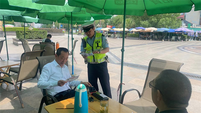 民警走进广场,通过现场咨询、发放宣传资料等形式,结合辖区当前道路交通情况,向广大群众宣讲道路交通安全法律法规,传播“礼让、文明”的交通理念