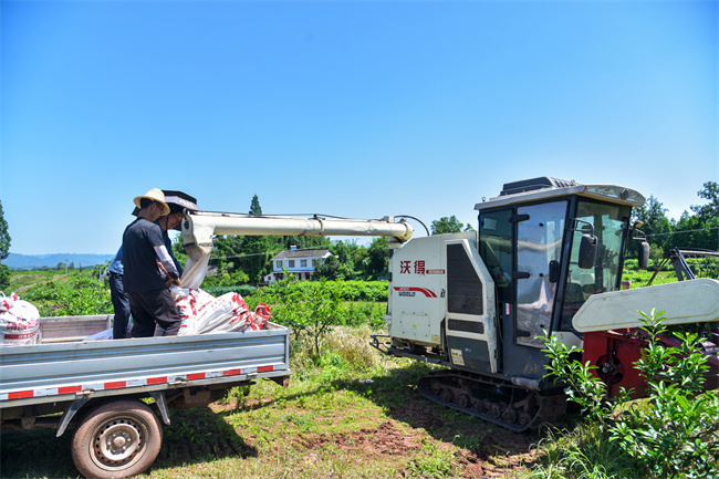 2024年5月13日,在中山镇邹岗村幼龄橘园套种小麦示范种植点,收割机来回穿梭,小麦一袋袋收获归仓。