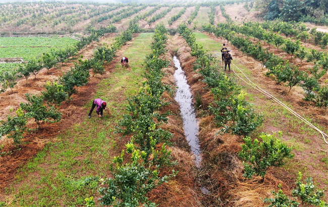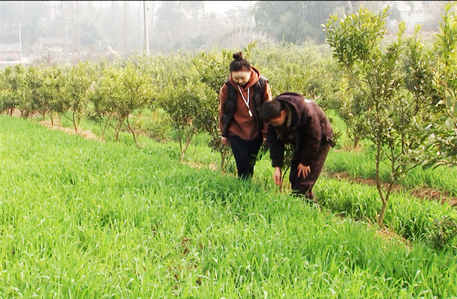 2023年12月8日,邹岗村柑橘行间套种小麦已发芽吐绿,农户正在管护小麦。
