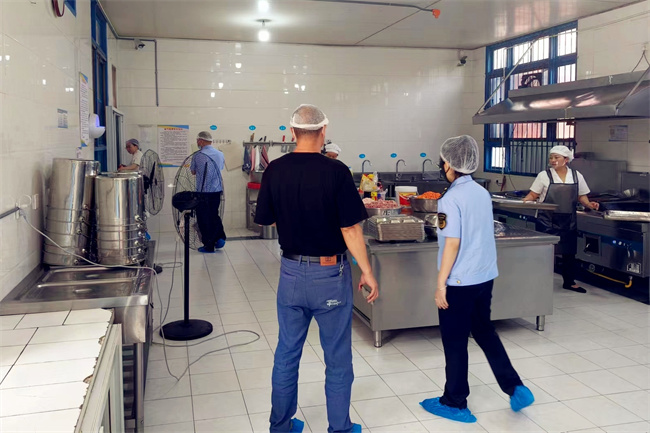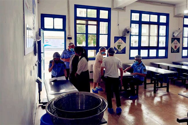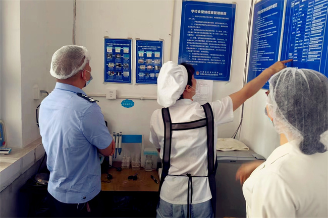 “你们好,我们是县刑侦大队和市场监督管理局的,今天来对食堂进行食品安全检查。”民警对食堂负责人说。