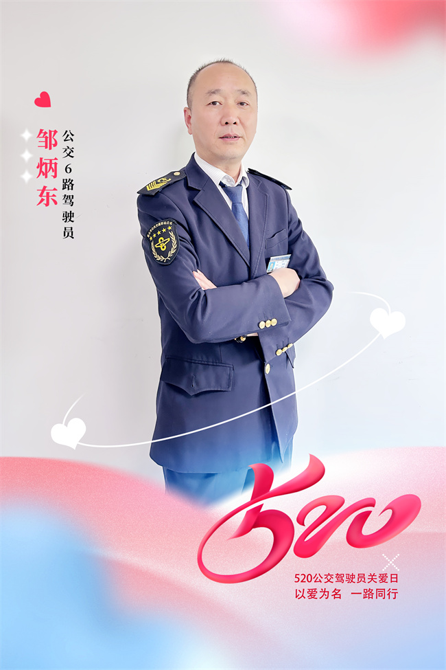 邹炳东,公交6路驾驶员,2014年2月进入公司。为给乘客提供温馨、舒适的乘车环境,他坚持以“十净一亮”的卫生标准严格要求自己,多年来,他坚持早上岗晚下班,把车体卫生打扫干净后再出发。他牢固树立“安全第一,预防为主”的思想,严守交通安全法律法规和公司各项规章制度,行车期间不开“赌气车”“英雄车”,做到安全驾驶、礼让斑马线,成为城市公共交通窗口的文明传播人。