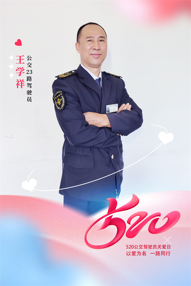王学祥,公交23路驾驶员,2014年12月进入公司。公交车是城市文明流动的窗口,在长期的工作中他心系乘客,用真情实感传递暖心服务,他凭借着精湛的技术和热情的服务,收获了来自市民群众的肯定,每当收到来自乘客的信任和表扬,王学祥脸上总是洋溢出自信和光荣的笑容,他表示:“作为一名公交驾驶员,我们所做的不仅仅是一份工作,更是对乘客的承诺,对社会的承诺,乘客的认可和满意就是我们最大的工作动力,让我们感到幸福快乐。”