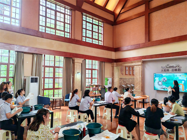 制作中,大家发挥想象与智慧,经过设计、折叠、扎花、染色、拆线等一系列步骤,不知不觉间,每个人手中的白色帆布包布变得色彩斑斓,呈现出一张张各具特色的扎染作品。