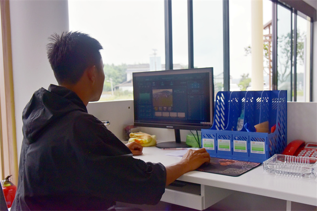 工作人员正在电脑上查看农田情况 李悦琴 摄