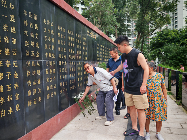 最后,亲属们手捧菊花一一来到英名墙前,抚摸着烈士的名字,在名字下方放上寄托哀思的菊花。
