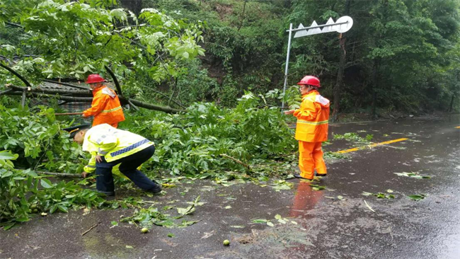 案例一:5月19日10时18分,因大暴雨来势凶猛,G351罗坝段行道树倒伏严重,阻碍交通,影响车辆通行,交通应急抢险分队第一时间奔赴现场,在险情处摆放反光锥桶,及时对路障进行清理,并对过往车辆进行了疏导。10时52分,路面恢复安全畅通。