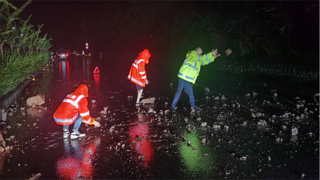 案例二:7月17日晚上8时10分,洪雅出现强降雨,G351、S308、X172、X171和西环线快速通道等线路出现多处水毁垮方、路基路面冲毁、树木倒塌。汛情发生后,县交通运输局紧急启动应急预案,出动装载机2台,挖掘机3台,抢险车15辆,公路养护、交通执法人员参与抢险70余人,连夜冒雨清理受阻道路,抢修受损路面、路基16余处,清理倒伏竹木40余处,清理零星塌方落石30余处。晚上8时45分,五条主干线全面恢复畅通。(供稿:洪雅县交通运输局 张佳雪 何妍)