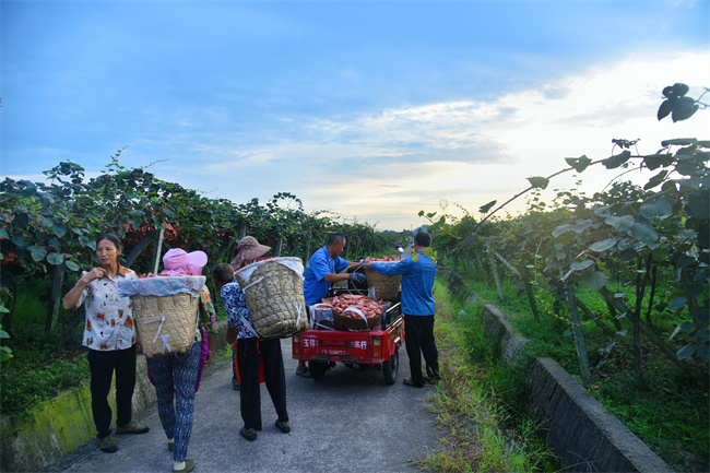 走进中保镇联丰村“兴星猕猴桃专业合作社”猕猴桃种植基地,一枝枝粗壮的猕猴桃藤蔓上绿叶葱郁,累累硕果压弯枝头并散发着诱人清香。村民们抢抓晴好天气,背着背篓穿梭在猕猴桃地里,熟练地采摘果子。在果园分拣车间,村民们正熟练地将刚刚采摘下来的猕猴桃进行拆袋、分拣、筛选、清理、装箱……果实翻滚跳跃,彰显着又一个猕猴桃丰收季的到来。