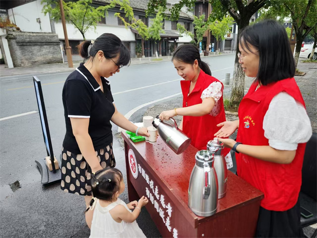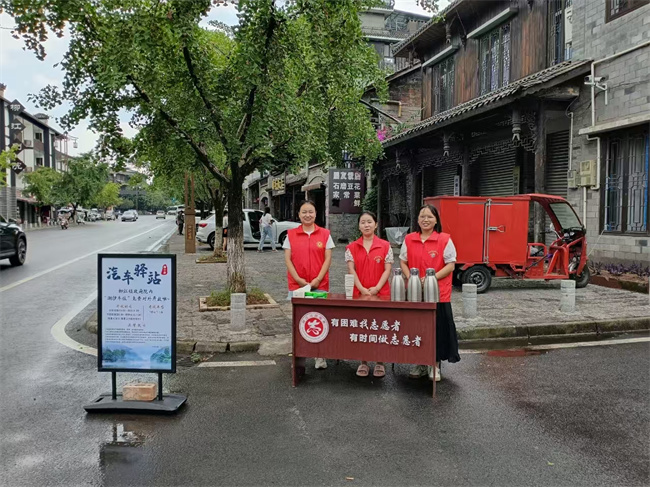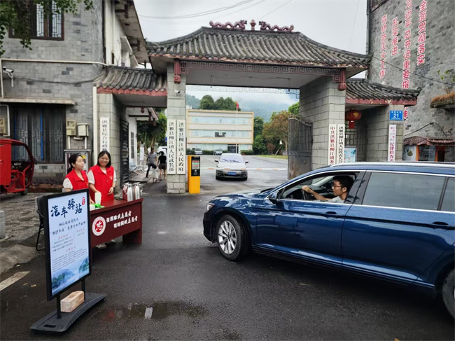 此外,驿站在门卫室设置了“爱心歇脚点”,向游客免费提供茶水、纸巾、免洗净手液、一次性纸杯等。同时,配备柳江镇机关“柳苗”志愿者轮岗值班,为游客提供停取车引导、古镇景点介绍等暖心服务。