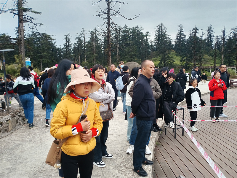 10月2日,在游客中心,游客们查看景区全景导游图,并排队有序购票。通过安检后,游客有的选择坐索道、有的选择乘大巴车、有的选择徒步上山。一路上,大家感受着瓦屋山人与自然和谐共生的新景象。