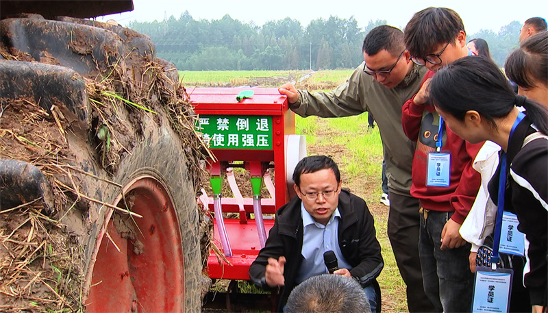“现在是小麦播种的关键时节。但近期雨水多,土壤湿度高,耕翻整地质量不高,所以今天现场会上就演示了免耕带旋播种技术……它不需要耕翻整地,直接免耕播种,出苗率还可以提高10%以上,这就为来年小麦丰收提供了很好的保障。”李朝苏介绍。