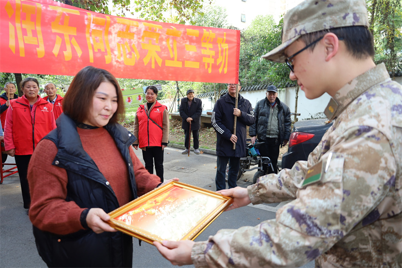 街坊邻居、社区居民纷纷走到路边街角观看,家里家外人头攒动,喜气盈门,共同见证军人荣耀,共同分享立功喜悦。彭润东家里,送喜报人员与军属贴心交谈,祝贺其在部队取得优异成绩,对军人家属的默默奉献和付出表示崇高敬意,并详细询问其家庭生活状况。彭润东的母亲手捧荣誉的喜报,看着墙上全家福里的孩子,脸上洋溢出自豪喜悦的笑容:“孩子能够荣立三等功,一家人都很高兴,感谢党和国家对孩子的培养,会继续鼓励他在部队安心服役,争取为国防事业贡献更多力量。”