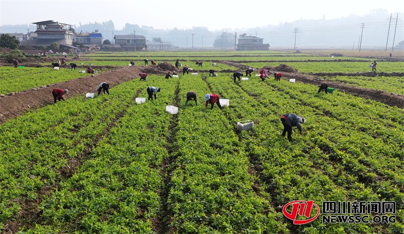 12月20日,在眉山市洪雅县止戈镇八角庙社区的几片田地里,豌豆苗长势喜人,已铺满地面。趁着露水褪去,承租该地块的种粮大户正雇佣工人采摘豌豆尖。大家穿梭在田间地头,熟练地采摘嫩绿的豌豆尖并放入箩筐。