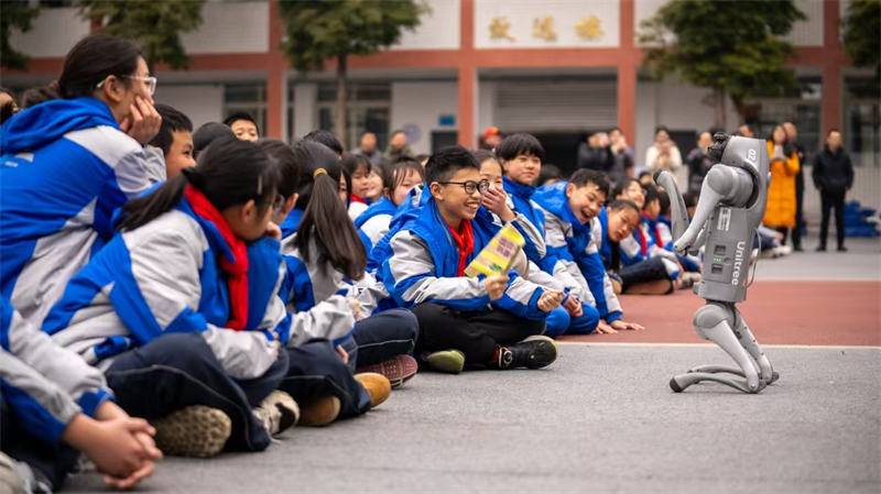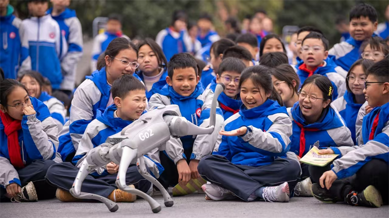 随后无人机、机器狗、编程小车轮番登场,同学们近距离观察这些科技产物,并了解其工作原理和应用领域,让他们更加惊叹科技发展的日新月异。