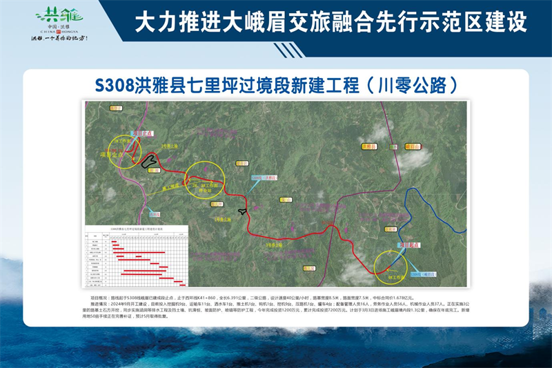 S308线眉山市洪雅县峨眉山界至桃源乡段新建工程起点顺接S308线峨眉已建成段止点,终点接西环线K41+833处,路线长6.391公里,二级公路,设计速度40公里/小时,路基宽8.5米,路面宽7.5米,设计荷载公路-I级,采用沥青混凝土路面。项目估算投资2.619亿元,中标合同价1.678亿元。